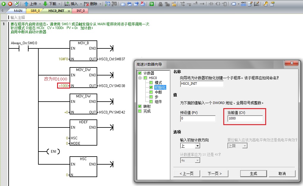 其次,在上电的第一周期将寄存器VD1000存储的数值传送到高速计数器的当前值SMD38,保证高速计数器以VD1000为初始值开始计数,并初始化高速计数器0。