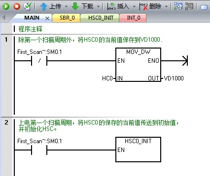 首先,在除了第一个扫描周期之外的其它周期,需要将高速计数器0的当前值HC0传送到寄存器VD1000中,如下图1所示,以保证寄存器VD1000始终存储的是HC0的当前值。