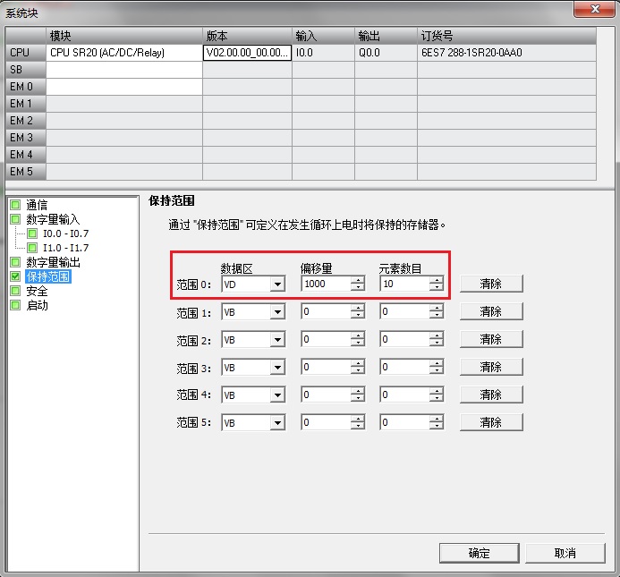 最后,在系统块的断电数据保持处设置寄存器VD1000为断电保持区域,如下图3所示。需要注意的是S7-200 SMART V存储区默认设置为断电数据不保持,如果将其设置为断电保持,则V区数据即为永久保持,