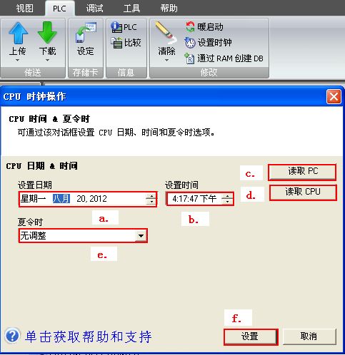 在 Micro/WIN SMART 菜单中选择“PLC “- >”设置实时时钟”,打开“PLC 时钟操作”对话框: