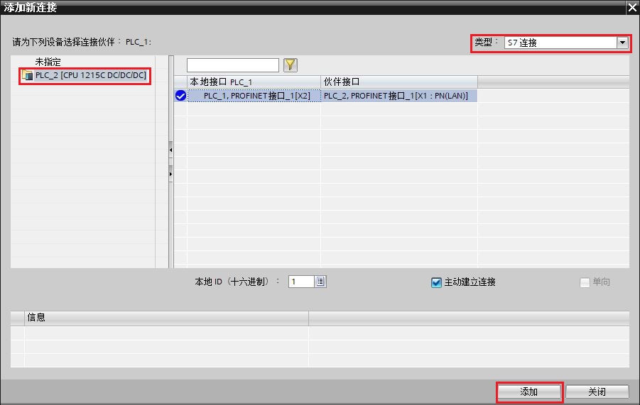 图1. 添加连接 然后在“Create new connection”窗口中,选择“Unspecified”,然后点击“Add”建立 S7 连接,如图2.所示。 图2.建立 S7 连接 “S7_Connection_1”为建立的连接,选中连接,在属性的“General”条目中定义连接对方 S7-1200PN 口的IP地址,如下图3.所示。 图3. 定义连接对方的 IP 地址 图4. 定义通讯双方的 TSAP 号 注意:S7-1200预留给S7连接两个TSAP地址:03.01和03.00图5. 连接 ID 号 配置完网络连接,编译保存并下载。 图6. 通讯连接状态 3. 软件编程 在 OB1 中,从“Instruction” >“Communication” >“S7 Communication”下,调用Get、Put通信指令,创建接收和发送数据块 DB3 和 DB4,定义成 101 个字节的数组,程序调用如下图7.所示。 图7. 程序调用功能 功能块管脚说明: CALL “GET” | ,%DB1 | //调用 GET,使用背景DB块:DB1; | REQ | :=%M0.7 | //系统时钟 2秒脉冲 ; | ID | :=W#16#0001 | //连接号,要与连接配置中一致,创建连接时的连接号,如图5.所示; | NDR | :=%M2.0 | //为1时,接收到新数据; | ERROR | :=%M2.1 | //为1时,有故障发生; | STATUS | :=%MW4 | //状态代码; | ADDR_1 | :=P#DB1.DBX0.0 BYTE 10 | //从通信伙伴数据区读取数据的地址; | RD_1 | :=P#DB3.DBX0.0 BYTE 10 | //本地接收数据地址; |