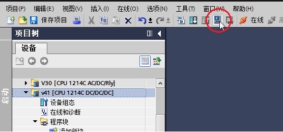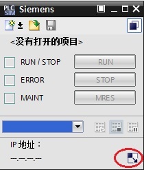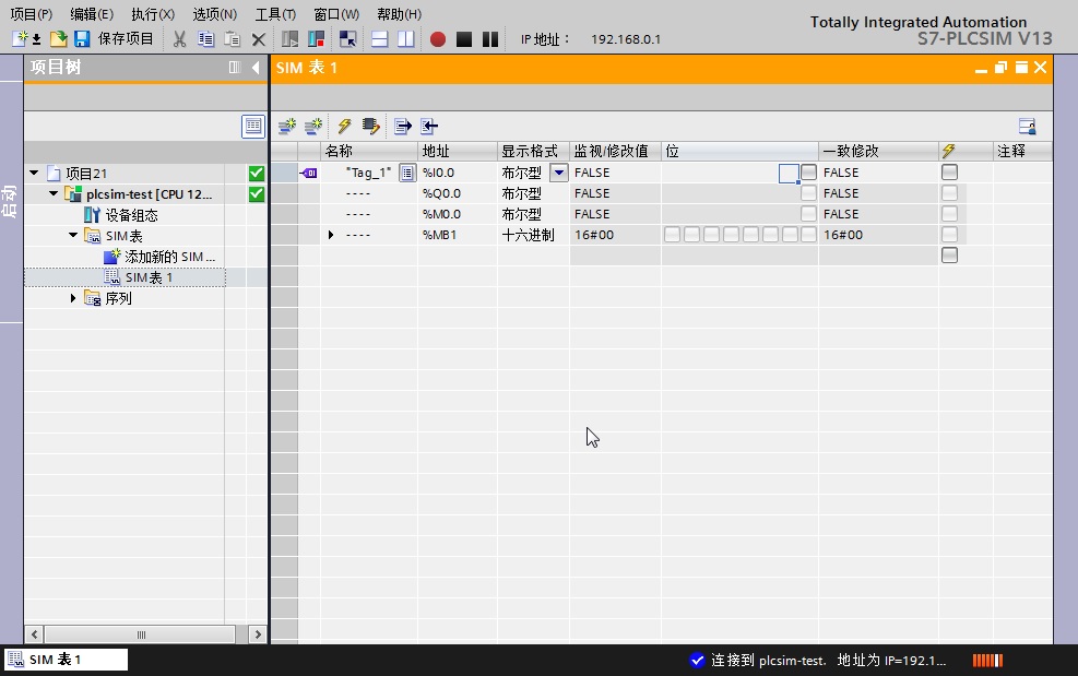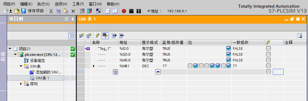 S7-1200 PLCSIM 使用入门点击博途软件的仿真按钮启动S7-1200仿真器,如图1: 图1. 启动仿真器 这时,会弹出仿真器对话框的精简视图,如下图所示: 图2. 仿真器 点击右下角按钮,可以切换到项目视图,如下图所示: 图3. 仿真器项目视图 点击左上角的新建按钮,可以新建一个仿真项目。 然后回到博途编程界面,选中项目里的1200 PLC ,点击下载按钮,会弹出如下下载选项对话框,按照图中所示选择接口,并点击“开始搜索”按钮,,在兼容设备对话框里会显示出仿真器设备,如图所示: 图4 下载选项 选中该设备,点击下载,即可将项目下载到1200仿真器中。 下载项目成功后,可以点击仿真器上的启动和停止按钮更改CPU的运行模式,如下图红色圈和绿色圈标注所示: 图5 启动和停止 在PLCSIM左侧项目树中可以看到SIM表,可以添加用户自己的SIM表,然后在该表中添加变量,进行变量值的监控和修改。 下面通过一个例子来说明仿真器的SIM表如何使用。 在SIM表1中添加几个简单变量I0.0,Q0.0, M0.0和MB1进行测试和说明,如下图所示: 图6. SIM表测试 此时点击“位”列的复选框,可以对I0.0进行值更改,如下图所示: 图7. SIM表更改输入点变量 但是默认情况下,只有输入 点是允许更改的,Q点或者M点的修改列为灰色,只能监视无法更改值。这时,如果想更改非输入点的值,需要点击工具栏的“启动/禁用非输入修改”按钮,便可以启动非输入变量的修改功能,如下图红框所示: 图8. 启动/禁用非输入修改 启动该功能后,便可以对刚刚建立的Q点及M点变量进行赋值操作了,如下图所示: 图9. SIM表更改非输入变量值
