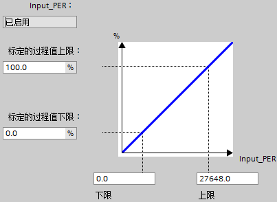 b. 如果过程值与模拟量输入值成正比,则将使用上下限值对来标定 Input_PER。