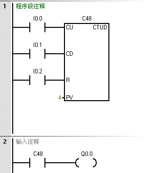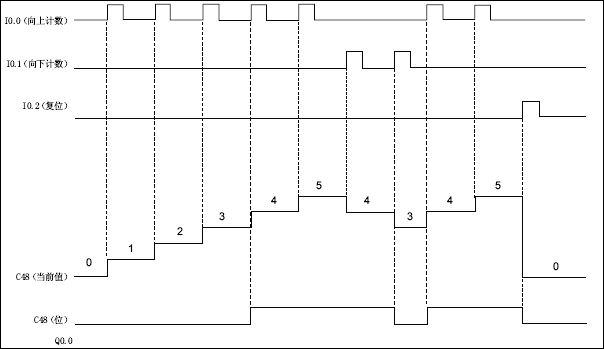 计数器计数范围为0~32,767。计数器号不能重复使用。计数器有两种寻址类型:Word(字)和Bit(位)。计数器号既可以用来访问计数器当前值,也可以用来表示计数器位的状态。 增/减计数器指令举例如下图所示:图2.增/减计数器指令 时序图如下所示: 图3.时序图 其中: - I0.0加计数;