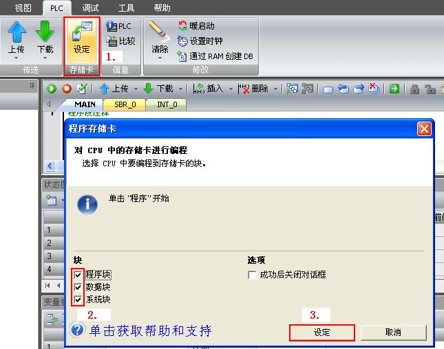 在 Micro/WIN SMART 中,点击"PLC"->"存储卡设定" ,单击"设定"按钮向下箭头,选择"PLC端的程序存储卡"如图4所示;