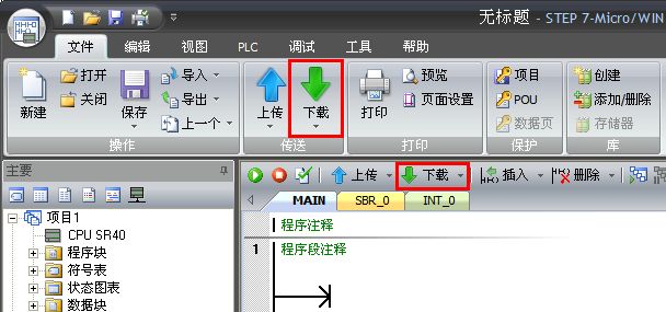 图 9. Micro/WIN SMART 界面中“下载”按钮位置 打开下载对话框(图 10),选择需要下载的块(如果进行了“步骤三”,则必须下载系统块才能完成 IP 地址修改),单击 “下载” 按钮进行下载。