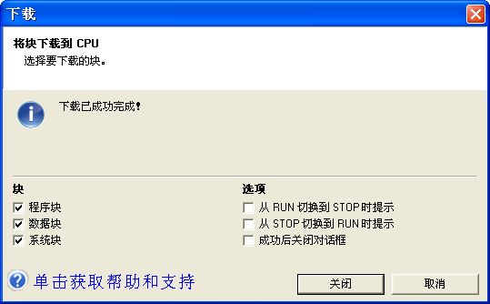 图 11. 下载成功对话框下载成功后,“下载” 对话框会显示 “下载成功” ,点击“关闭”按钮关闭对话框,完成下载,如图 11 所示。 注意:如果用户在完成通信设置(步骤一)后打开一个新的项目文件再进行下载操作会要求用户重新进行通信连接设置。 常问问题: 1.为何程序下载不成功?产生此问题的原因有很多,可按照如下步骤逐一检查: - 检查硬件连接