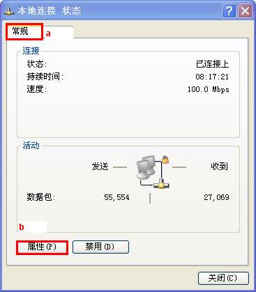 图 4. “本地连接 状态” 对话框 - 单击 “属性” 按钮,打开 “本地连接 属性” 对话框,如图 5所示;