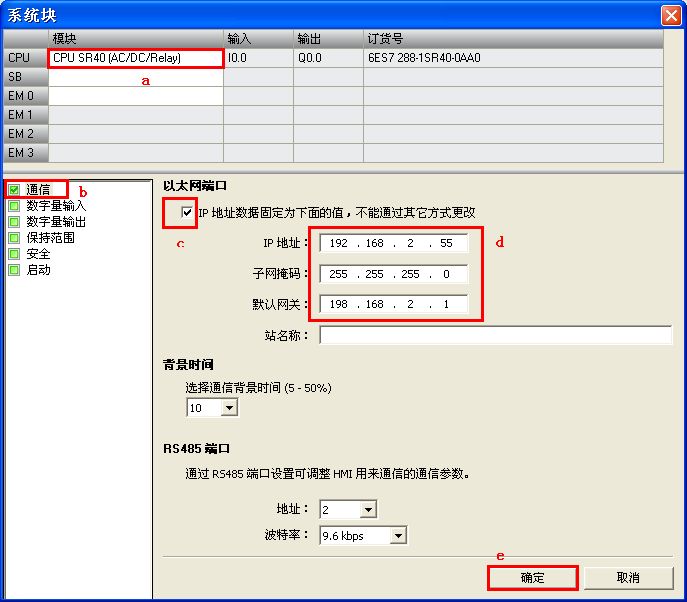 注意:IP 地址的前三个字节必须同 CPU 的 IP 地址一致,后一个字节应在 "1-254" 之间(避免 0 和 255 ),避免与 网络中其它设备的 IP 地址重复。