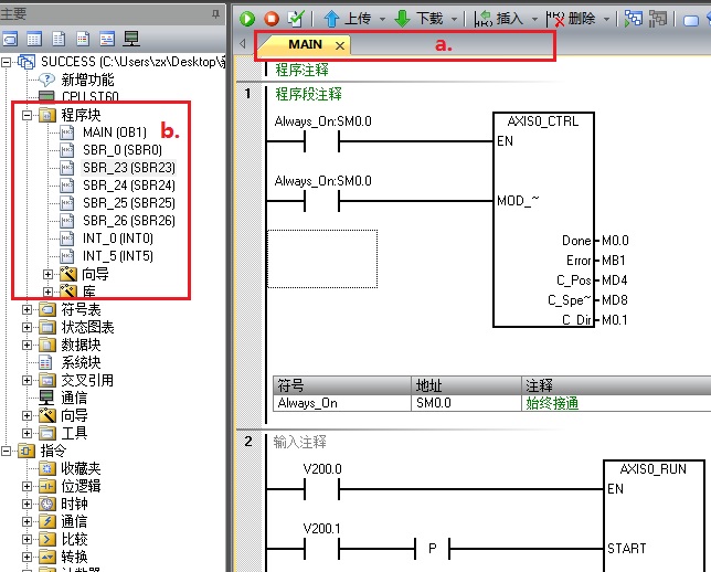 2.为什么 S7-200 SMART上传程序后程序块丢失?如果程序上传的过程中没有报错,但是打开上传程序后,只看到主程序或者只显示部分程序如下图a.,有可能是因为其他程序块未打开,可以点击图中b.的程序块文件夹,选择需要查看的程序块,双击打开即可。