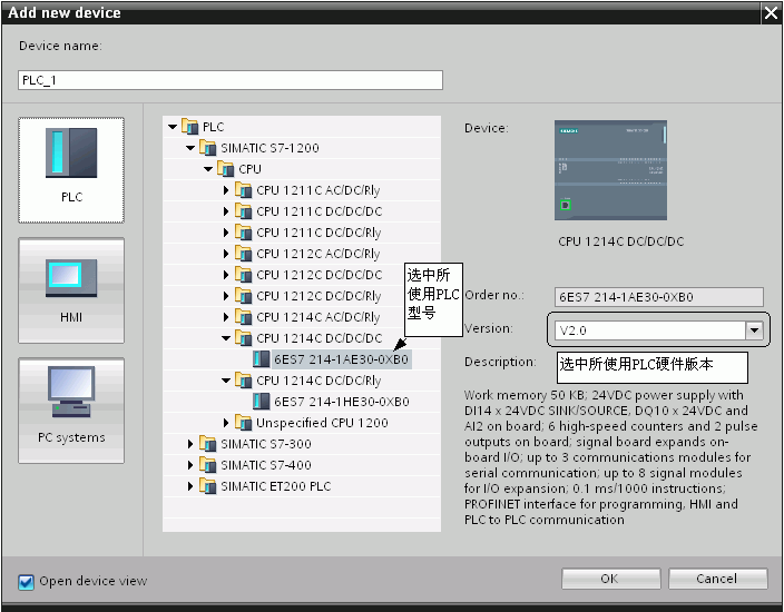 然后进入 “Project view”,在“Project tree” 下双击 “Add new device”,在对话框中选择所使用的S7-1200 CPU添加到机架上,命名为 PLC_1,如图1所示。