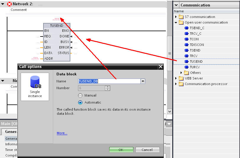 进入 “Project tree” > “ PLC_1” > “Program blocks” > “OB1” 主程序中,从右侧窗口 “Instructions” > “Communications” > “OPEN User Communications”下调用 “TUSEND” 指令,,如图8所示。