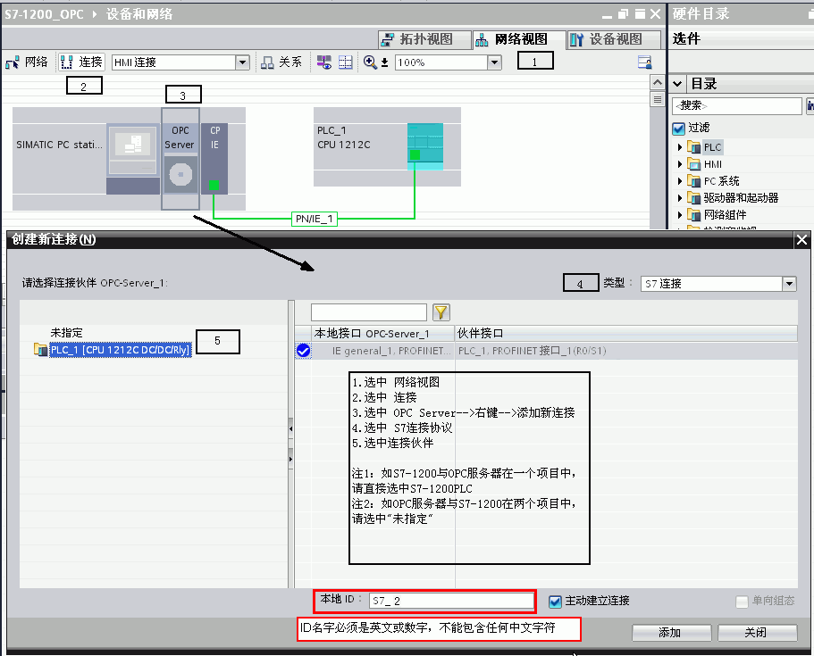 通过点击“网络视图”的图标,进入网络配置,然后在网络视图设置连接,添加S7连接,详见图4中的1~5步所示。