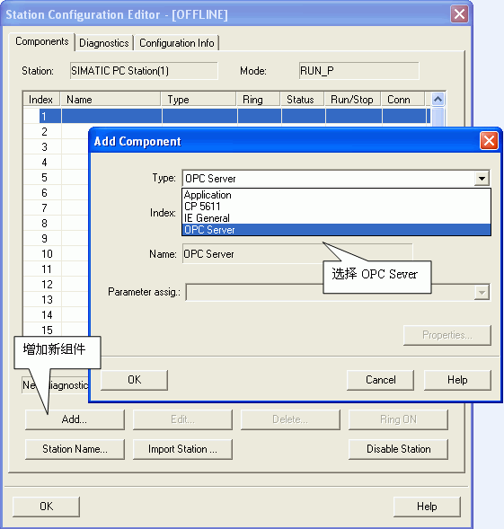 注意:TIA V11 中的PC Station硬件组态与虚拟PC Station硬件机架的名字、组件及“Index”必须完全一致。
