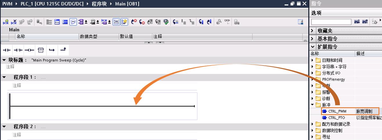 1. 在Portal软件中打开程序块,进行PWM的编程。在指令选件中的“扩展指令”中的“脉冲”文件夹中可以找到CTRL_PWM指令。可以通过双击指令或是拖拽的方式把CTRL_PWM指令放到程序编辑区。如下图所示: