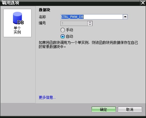 2. 在插入CTRL_PWM指令时会提示关联背景数据块,如下图所示,该数据块的名称和编号可以由用户手动设置,也可以选择系统默认值。