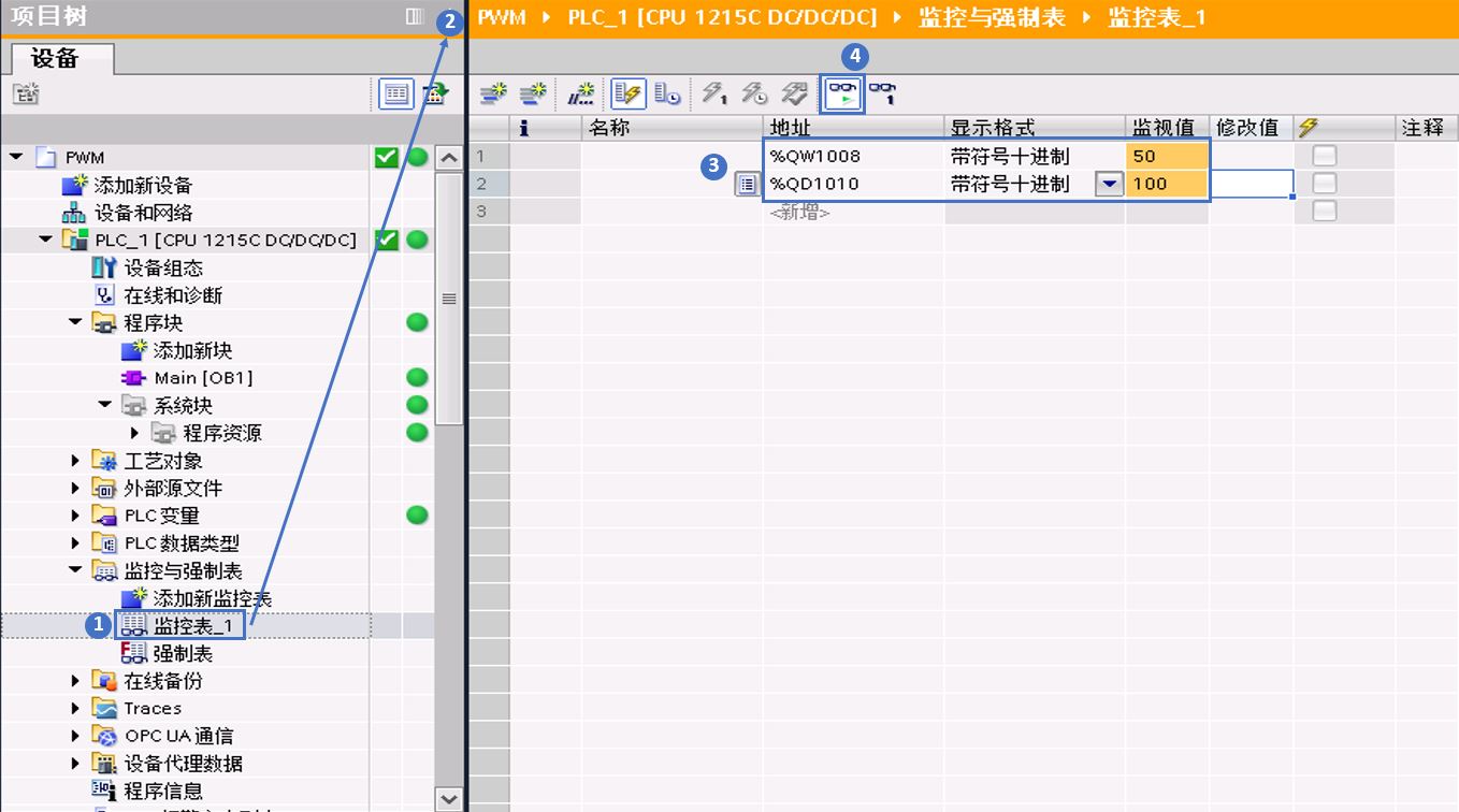 如下图所示,① 在Portal软件左侧项目树中的“监控与强制表”中插入一个新的监控表,②在打开的空白监控表中的“地址”列手动输入QW1000,如然后在“显示格式”一列选择“带符号十进制”,如下图步骤③所示。点击监控按钮,如图中④ 所示,可以看到QW1000的监控值为50,该值是组态PWM时设置的初始脉冲宽度值。