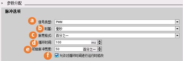d. 循环时间:表示PWM脉冲的周期时间,Portal 软件中对“循环时间”限定的范围值:1~16777215。