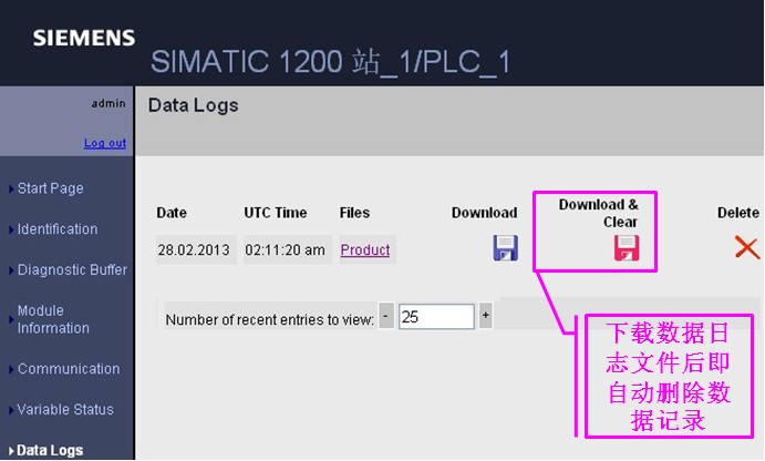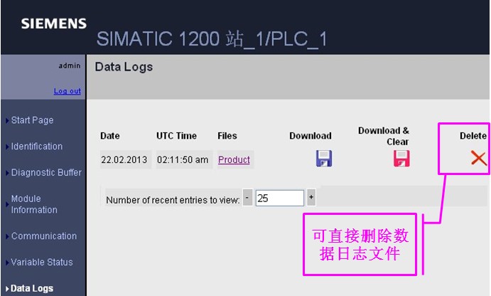 2. 以管理员身份登录 PLC 内置 We b服务器,在 Data Logs 页面下可清除数据日志。如下图2所示: