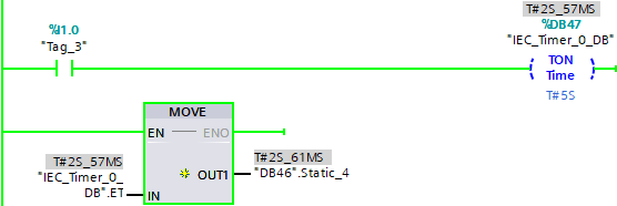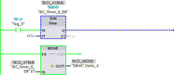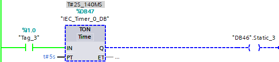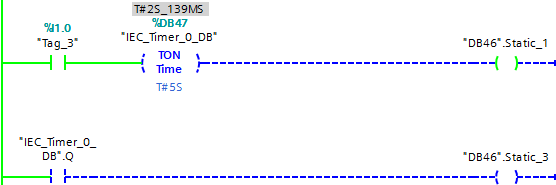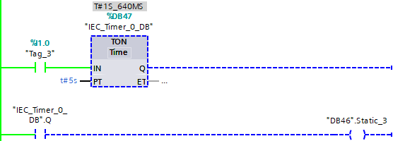 (3) 线圈型定时器如果出现在网络段中间时不影响RLO的变化,如图14所示,"DB46".Static_1和I1.0同步变化。