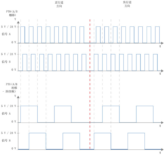 PTO(A/B相移):也就是常见的AB正交信号,当A相超前B相1/4周期时,电机正转;相反,当B相超前A相1/4周期时,电机反转。 如下图所示: