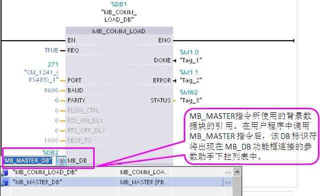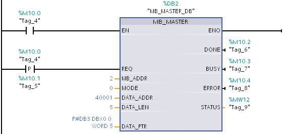 表2 Modbus地址对应关系 图9 MB_MASTER指令 MB_MASTER指令参数意义如下表3所示: 引脚 | 说明 | | | | 在上升沿执行该指令,请求将数据发送或读取到Modbus从站 | | Modbus RTU从站地址。默认地址范围:0至247;扩展地址范围:0至65535。值0被保留用于将消息广播到所有Modbus从站。 | | | | 从站中的起始地址:指定Modbus从站中将供访问的数据的起始地址。 | | | | 数据指针: 指向要写入或读取的数据的 M 或 DB 地址(DB访问类型必须是标准与S7-300/400兼容)。 | | 完成位:上一请求已完成且没有出错后,DONE 位将保持为 TRUE 一个扫描周期时间。 | | 0 – 无正在进行的 MB_MASTER 操作; 1 – MB_MASTER 操作正在进行 | | 错误位: 上一请求因错误而终止后,ERROR 位将保持为 TRUE 一个扫
