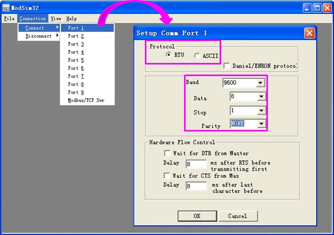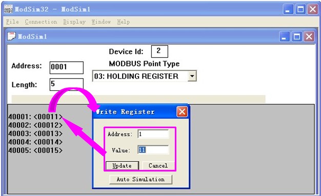 表4 MB_MASTER Modbus功能表 6. Modbus 从站软件设置 注意:Modbus RTU从站采用ModSim软件测试,该软件是第三方软件,可以从 Internet 网络下载。在打开的ModSim软件中建立连接,并设置RTU模式的参数:波特率Baud=9600,数据位Data=8,停止位Stop=1,校验Parity=NONE,如下图10所示: 图10 建立ModSim连接 选择“File”→“New”打开ModSim通信界面,设置Modbus RTU从站的地址Device Id=2,开始地址Address=0001,数据长度Length=5,Modbus数据类型功能码03。分别双击各Modbus地址后的数据区,出现“Write Register"对话框,在此写入数据值,如下图11所示: 注意:Device Id设置必须与“MB_MASTER”指令中输入引脚“MB_ADDR”设置的地址一致。图11 设置ModSim 7. Modbus RTU测试结果 在STEP 7 Professional V11 UPD4软件中打开该项目CPU1215C DC/DC/DC的“监控表”,触发“MB_MASER”指令的输入位M10.0。Modbus RTU主站将ModSim从站地址40001中的数值11,40002中的数值12,40003中的数值13,40004中的数值14,40005中的数值15,分别读取到了地址DB3.DBW0,DB3.DBW2,DB3.DBW4,DB3.DBW6,DB3.DBW8中,如下图12所示: 图12 Modbus RTU测试结果 S7-1200 Modbus RTU通信模式的多地址或多站点轮询多个CM 1241 RS485 通讯模块之间可以使用 PROFIBUS 电缆相互连接。可以将 1 个主站和最多 31 个 MODBUS 从站使用 PROFIBUS 电缆连接组网。 S7-1200 Modbus RTU轮询需要通过上一条”MB_MASTER“指令输出位“Done“=1来触发下一条“MB_MASTER“指令。具体说明及编程思路请参考以下链接: 如何使用STEP 7(TIA Portal)V11为SIMATIC S7-1200建立Modbus RTU通讯? MB_COMM_LOAD和MB_MASTER指令STATUS错误代码STATUS(W#16#) | 说明 | 0000 | 端口无错误 | 8180 | 端口ID值无效 | 8181 | 波特率值无效 | 8182 | 奇偶校验值无效 | 8183 | 流控制值无效 | 8184 | 响应超时值无效 | 8185 | MB_DB参数不是MB_MASTER或MB_SLAVE的背景数据块 |