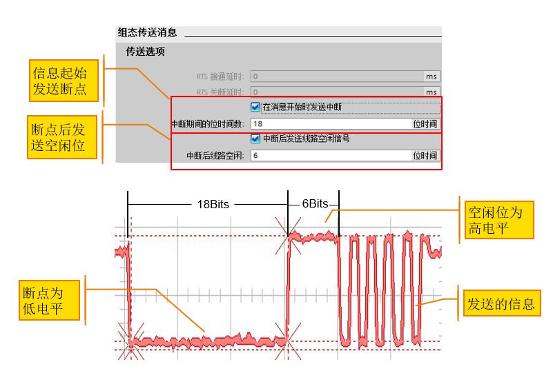 答:发送配置中设置的字符中断小于等于16位时,系统自动发出16位的字符中断位;设置大于16位时,则发出的中断位与实际设置相符。下图是设置的发送断点及空闲线位及其实际发出的波形图。