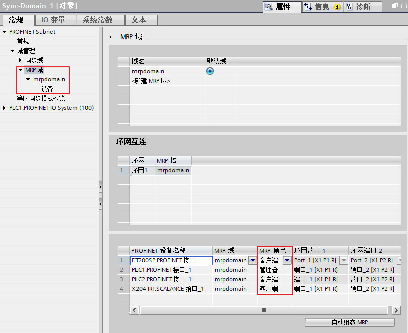 域管理视图可以选择所属MRP域,并可以对域名称进行重命名,这里选择默认MRP域,还可以对设备的MRP角色以及环网端口进行分配,这里根据表1来分配MRP角色及环网端口。