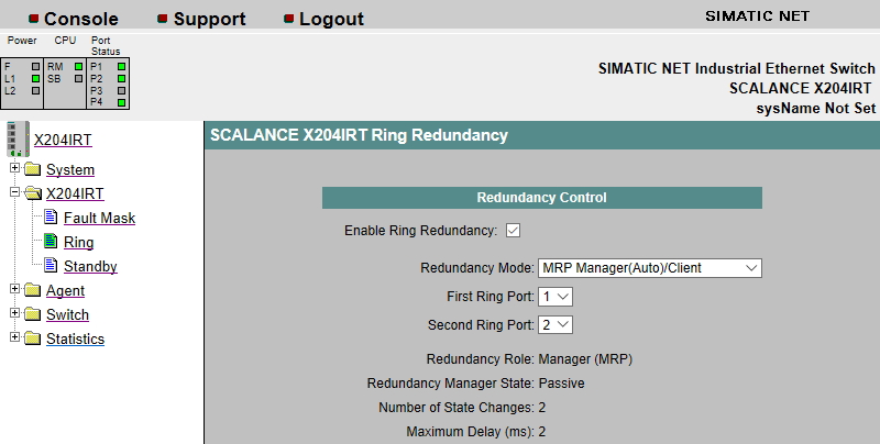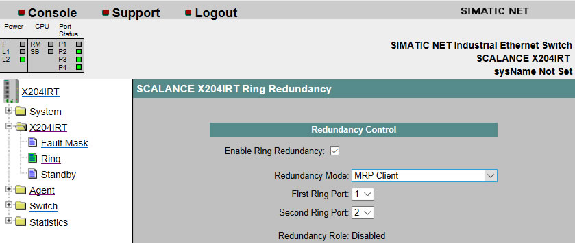 • 环网中的某个设备可用作冗余管理器,其它设备均为冗余客户端。