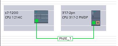 在项目树 “项目树”>“设备和网络” >“网络视图” 视图下,创建两个设备的连接。用鼠标点中 S7-1200 上的PROFINET通信口的绿色小方框,然后拖拽出一条线,到另外一个 317-2PN 上的PROFINET通信口上,松开鼠标,连接就建立起来了,如图17所示。