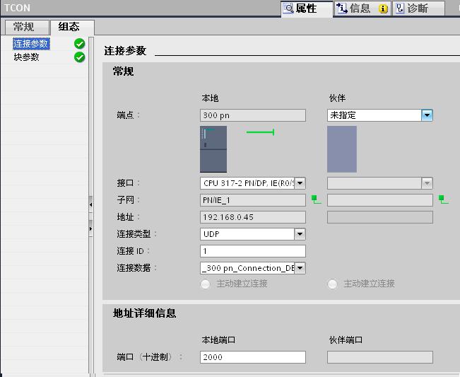 S7-300 的 “TCON”指令的连接参数需要在指令下方的属性窗口“属性”> “组态”>“连接参数中”中设置,如图19所示。