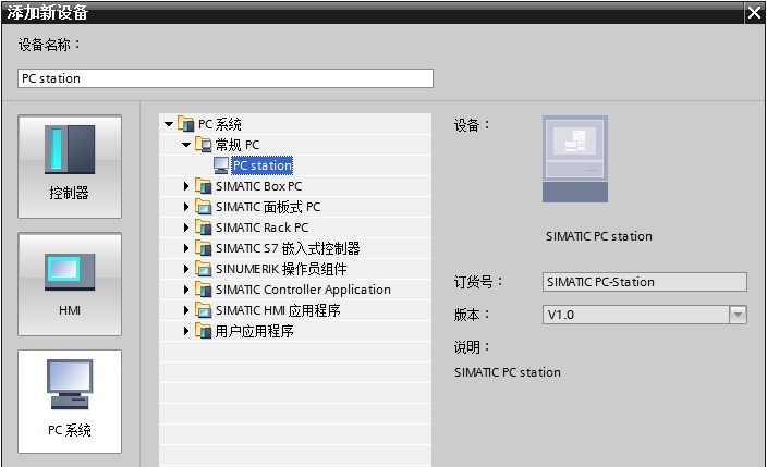 再次通过“添加新设备”创建 PC 站,在 “PC 系统”里,选择 PC station,插入一个 PC 站。如图 3 所示。