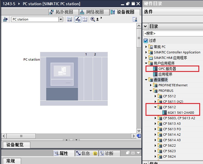 在“用户应用程序”中,将“OPC服务器”插入第 1 槽;在“通信模块”中,将“CP5612”插入第 2 槽。如图 4 所示。