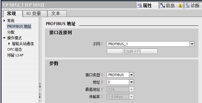 在 PC 站的设备视图中,进入 CP5612 卡的属性框,在“PROFIBUS 地址”中选择子网“PROFIBUS_1”,DP 地址分配成 3。如图 6 所示。