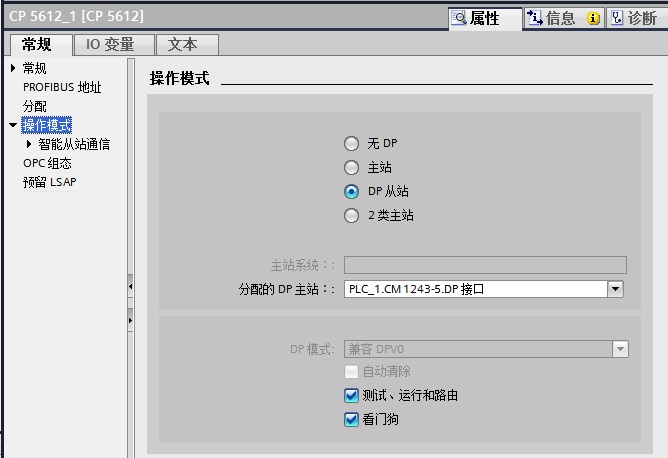 在“操作模式”中选择“DP 从站”,在“分配的 DP 主站”选择“PLC.CM1243-5.DP 接口”。如图 7 所示。