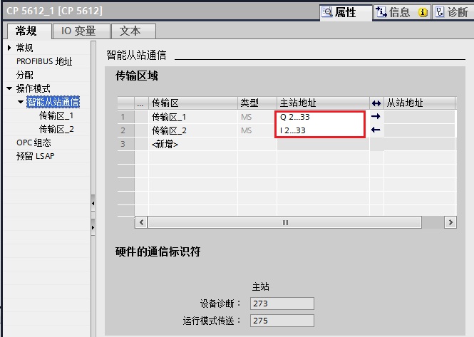 在“智能从站通信”中,添加 2 个传输区,一个是输入区,一个是输出区(注意图8 红框中描述的是主站地址,分别从 QB2 和 IB2 开始,该地址在后面通信中将会使用到,请留意)。如图 8 所示。