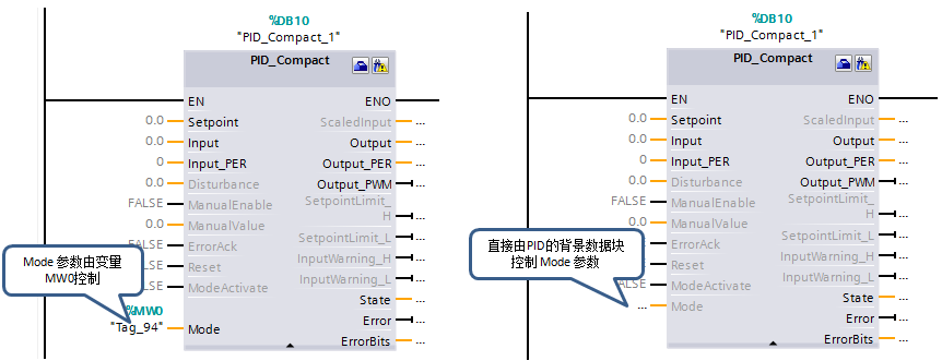 2. PID Compact V2 时,使用其 Mode 和 ModeActive 来控制 PID 的工作模式(如 Mode=0,PID 未激活)。