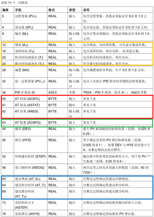 通过查询系统手册中 《PID回路和整定》章节,PID 回路表占用的存储器 V 区地址中所代表功能,见表1-PID 回路表: